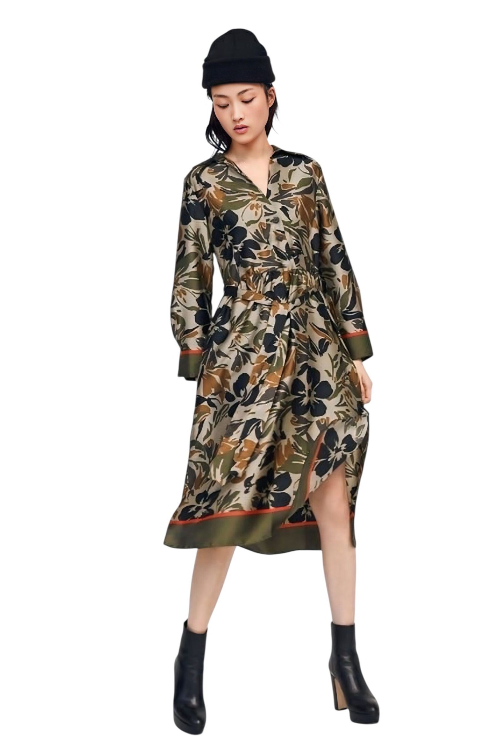 Destaca por su estampado floral grande en colores como verde oliva, negro, beige y café, lo que le da un aire sofisticado y muy en tendencia. Además, el detalle en el borde inferior con línea en tono rojo oscuro le aporta un toque único y especial.