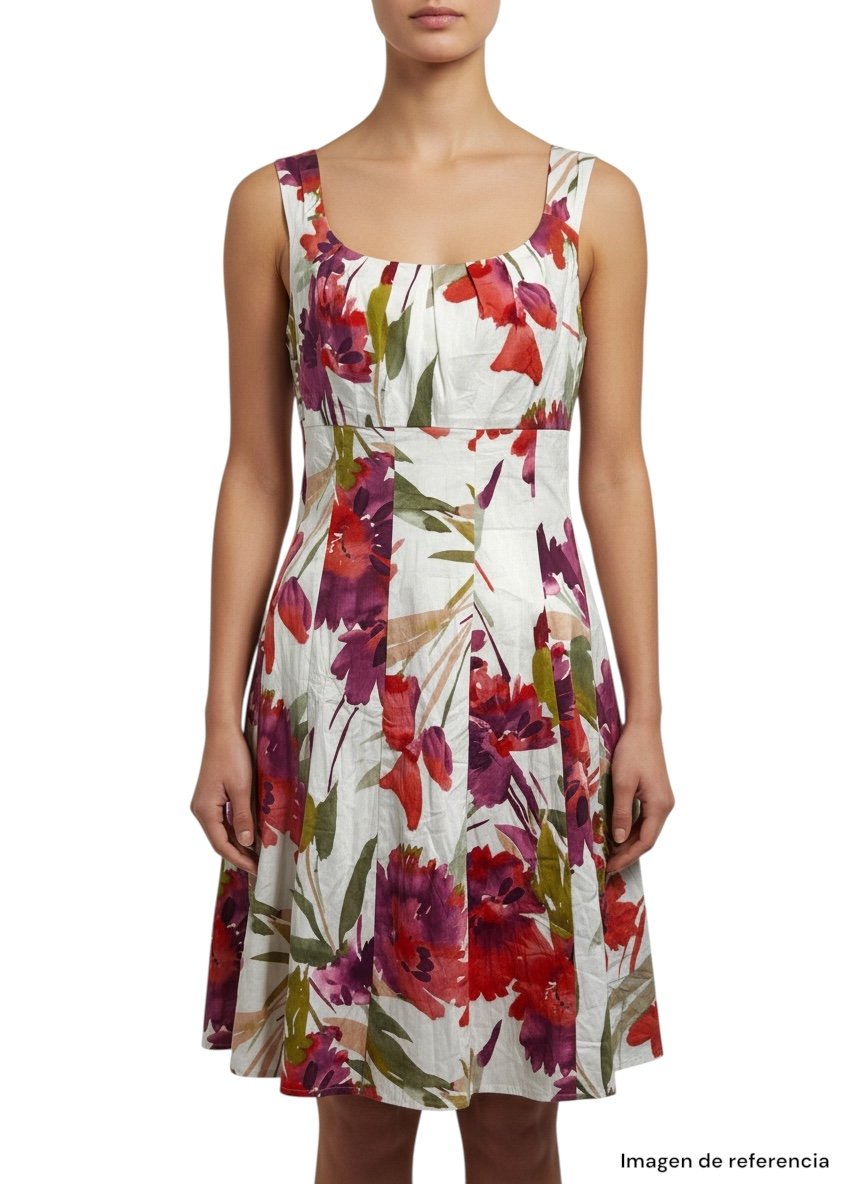 Presenta un estampado floral en tonos rojos, vino y verdes sobre fondo claro, que le da un estilo delicado pero llamativo.