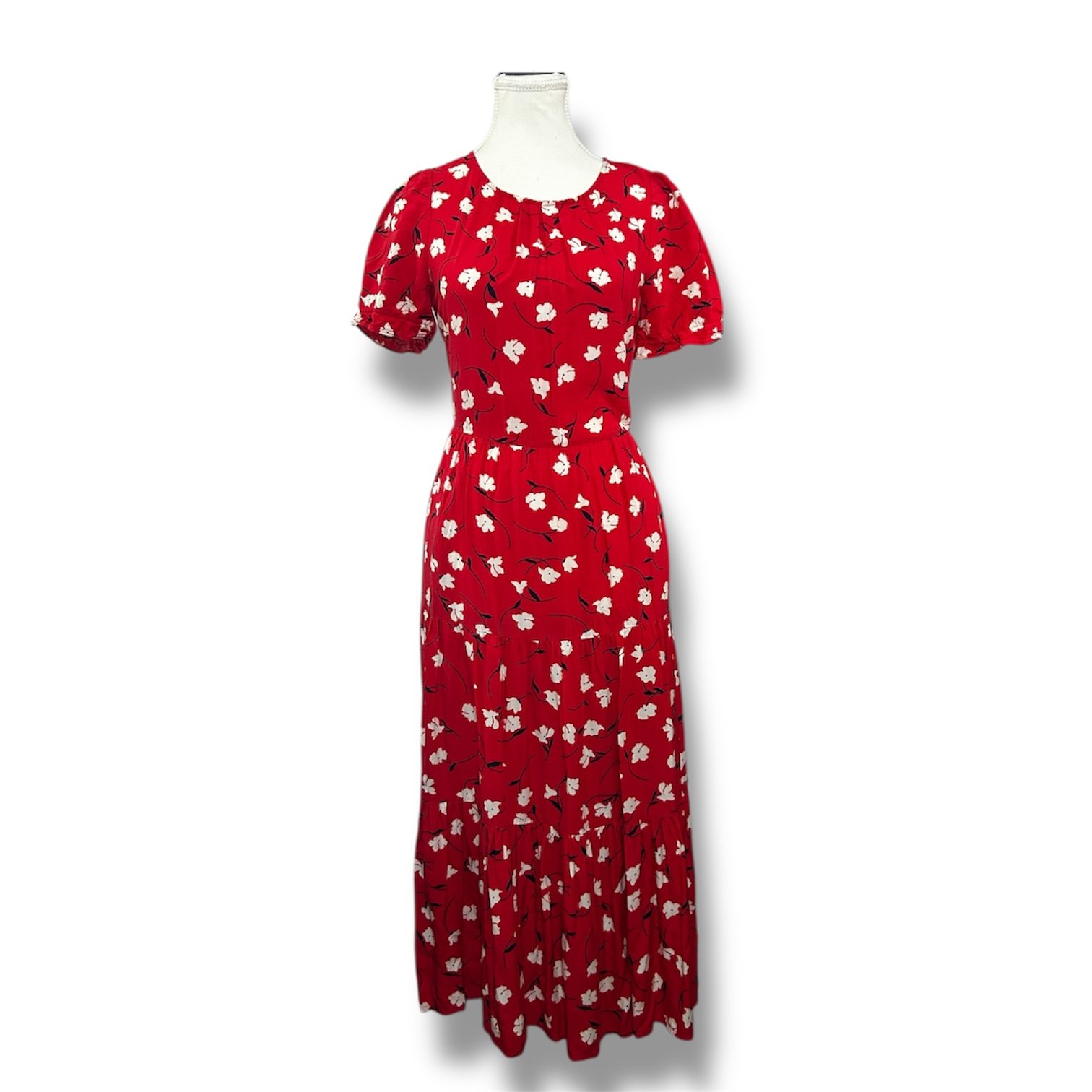 Encantador vestido rojo de la marca J.Crew en talla XS con un delicado estampado floral que aporta frescura y feminidad.