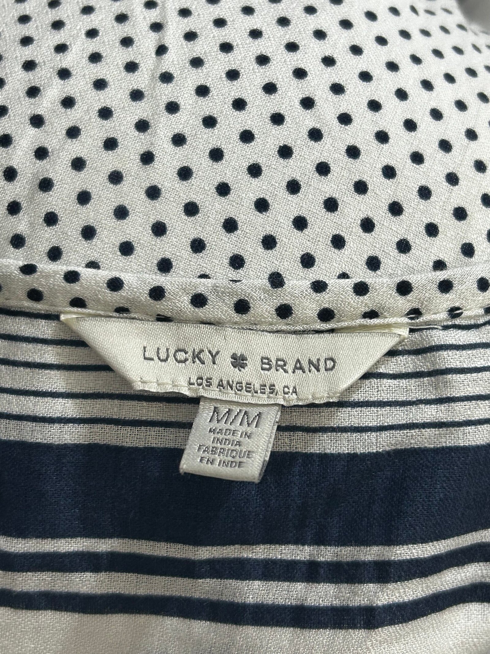 Vestido Lucky Brand talla M en color crema con estampado negro. Diseño sin mangas con botones frontales y cintura definida. Elegante, ligero y muy cómodo.