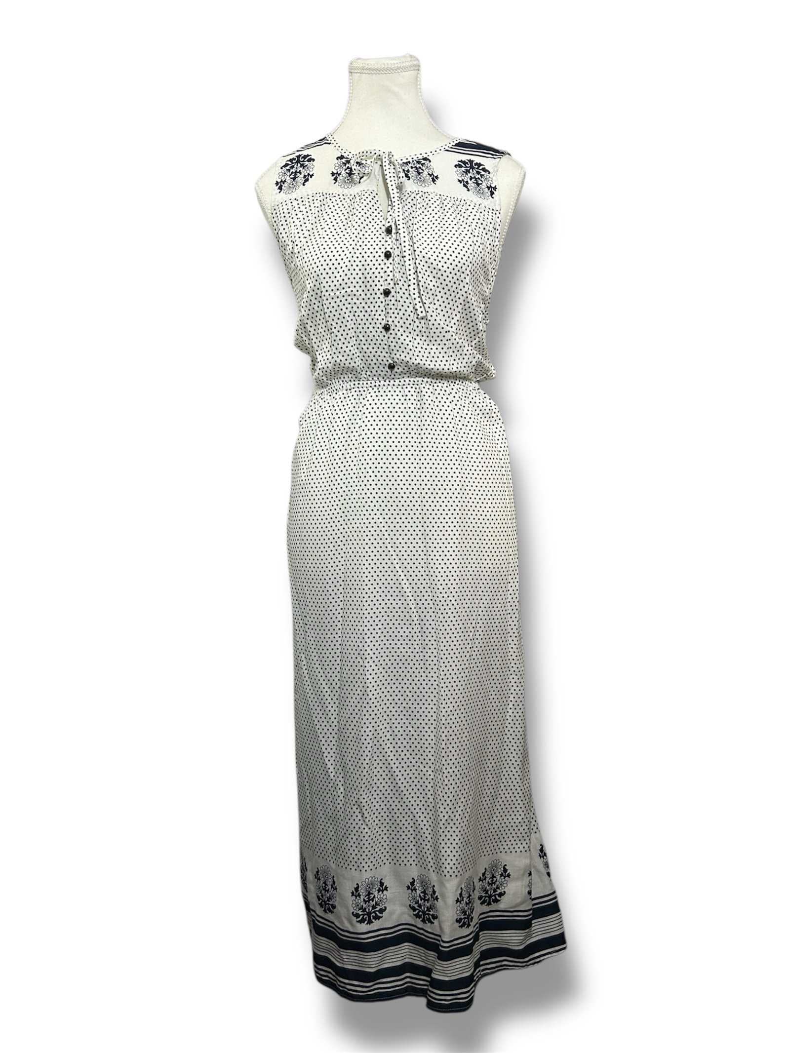 Vestido midi de la marca Lucky Brand, talla M, en tono crema con estampado negro de lunares y detalles florales. Diseño sin mangas, con botones frontales decorativos y un pequeño lazo en el escote que aporta un toque femenino. La cintura marcada estiliza la silueta y la falda tiene una caída fluida con detalles decorativos en el bajo. Es una prenda ligera y versátil, ideal para primavera y verano, perfecta para looks casuales, vacaciones o salidas informales.