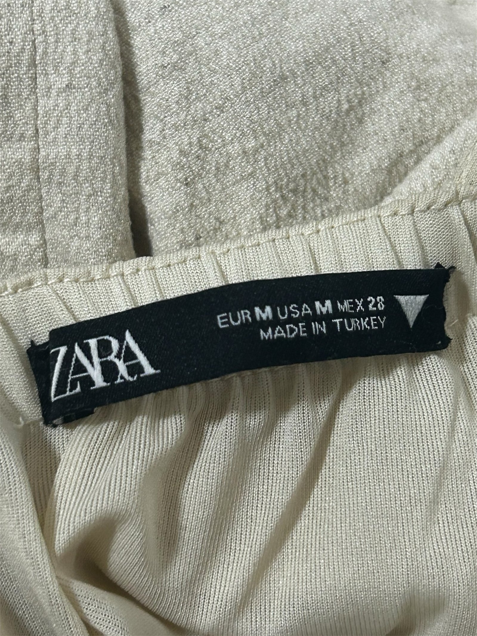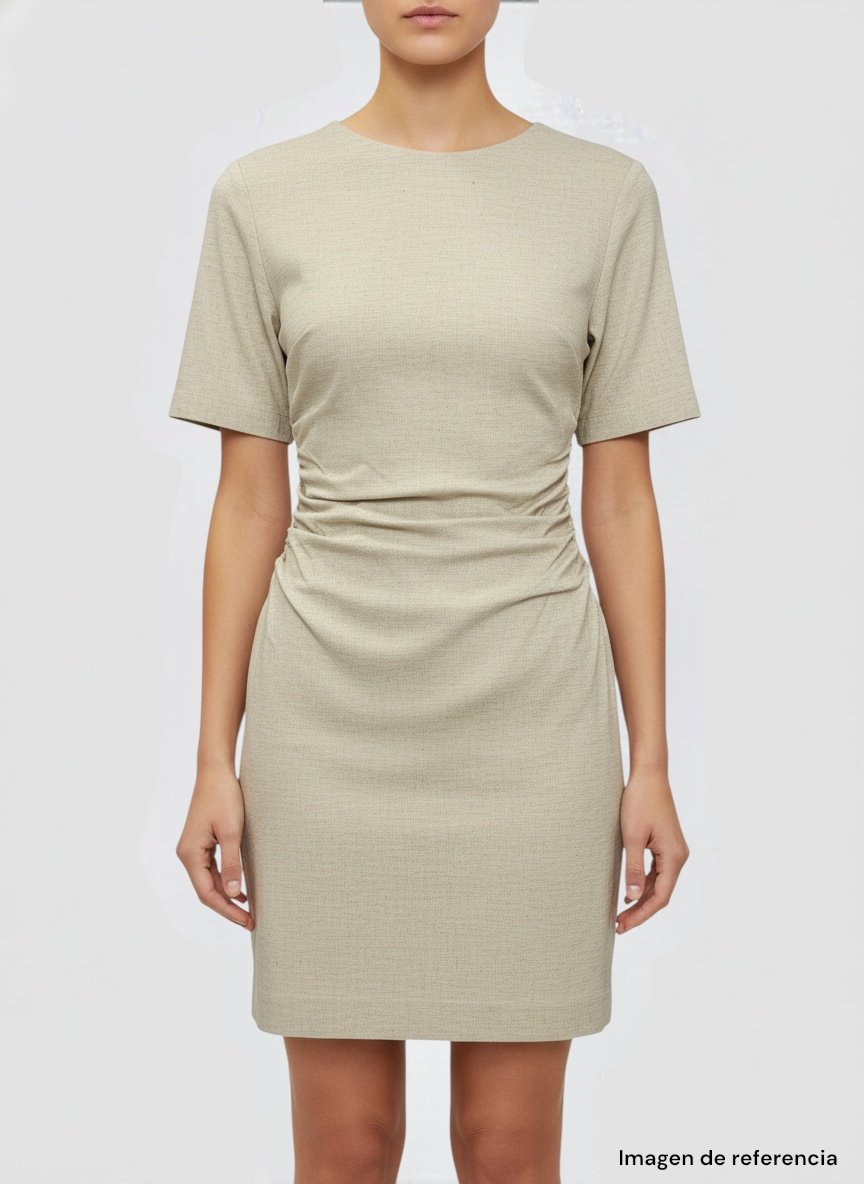 Vestido Zara talla M en un elegante tono beige con diseño minimalista y moderno. Su corte recto con ligero drapeado en la cintura estiliza la figura y aporta un toque sofisticado, además cuenta con abertura en la parte de la espalda.
