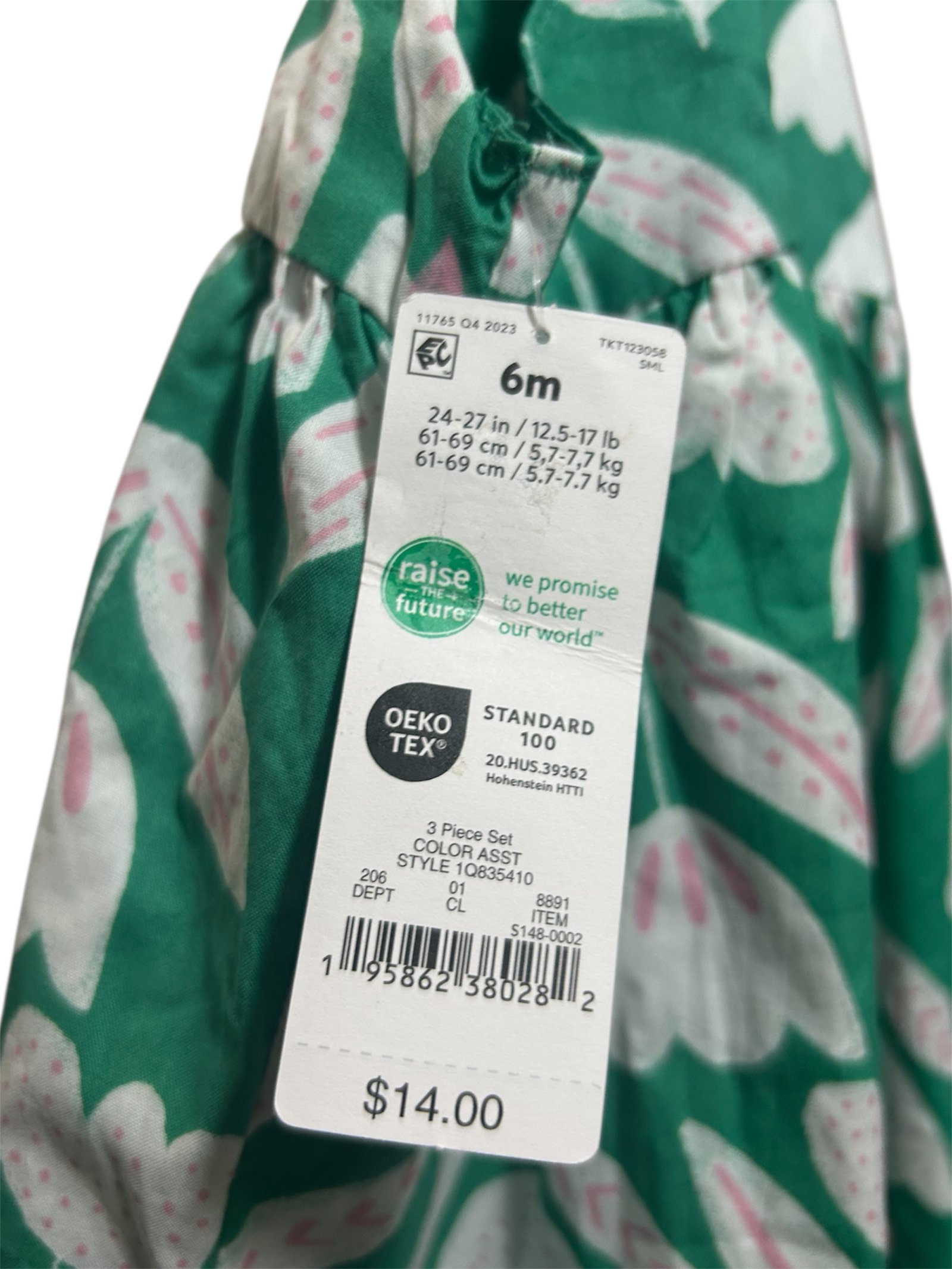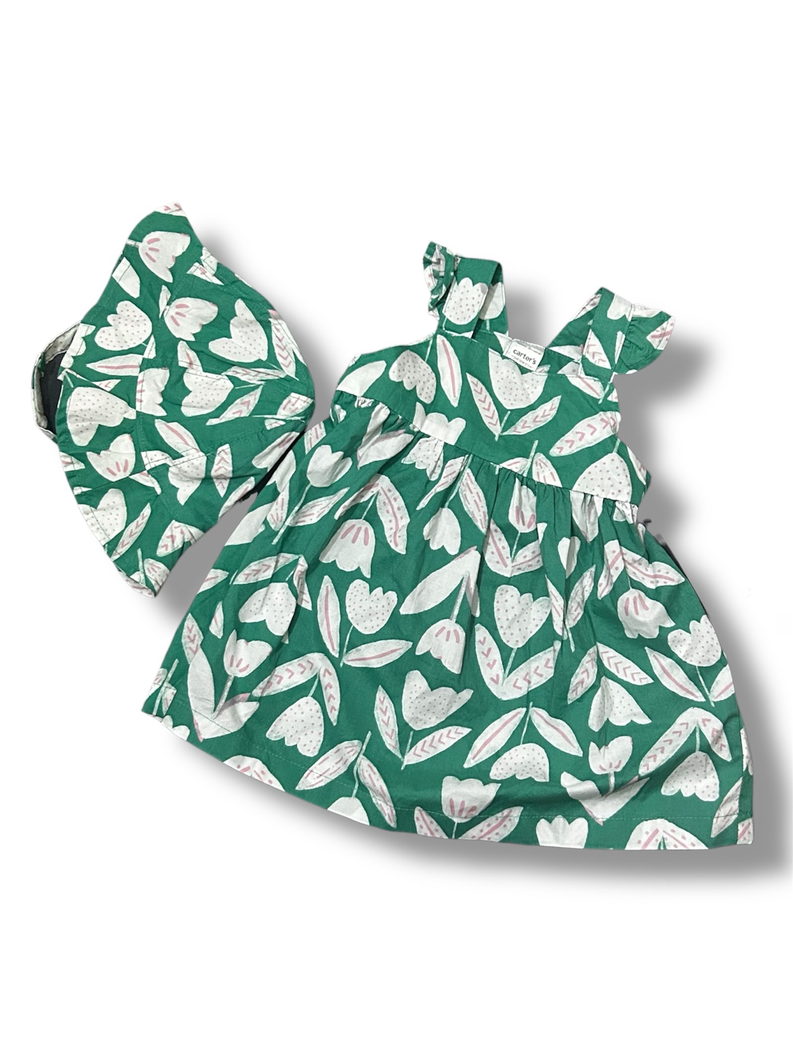 Hermoso conjunto para bebé de la marca Carter’s en talla 6 meses, compuesto por un vestido con delicado estampado floral en tonos blancos y rosados sobre un fondo verde vibrante. El diseño incluye tirantes con pequeños volantes que aportan un toque dulce y femenino.