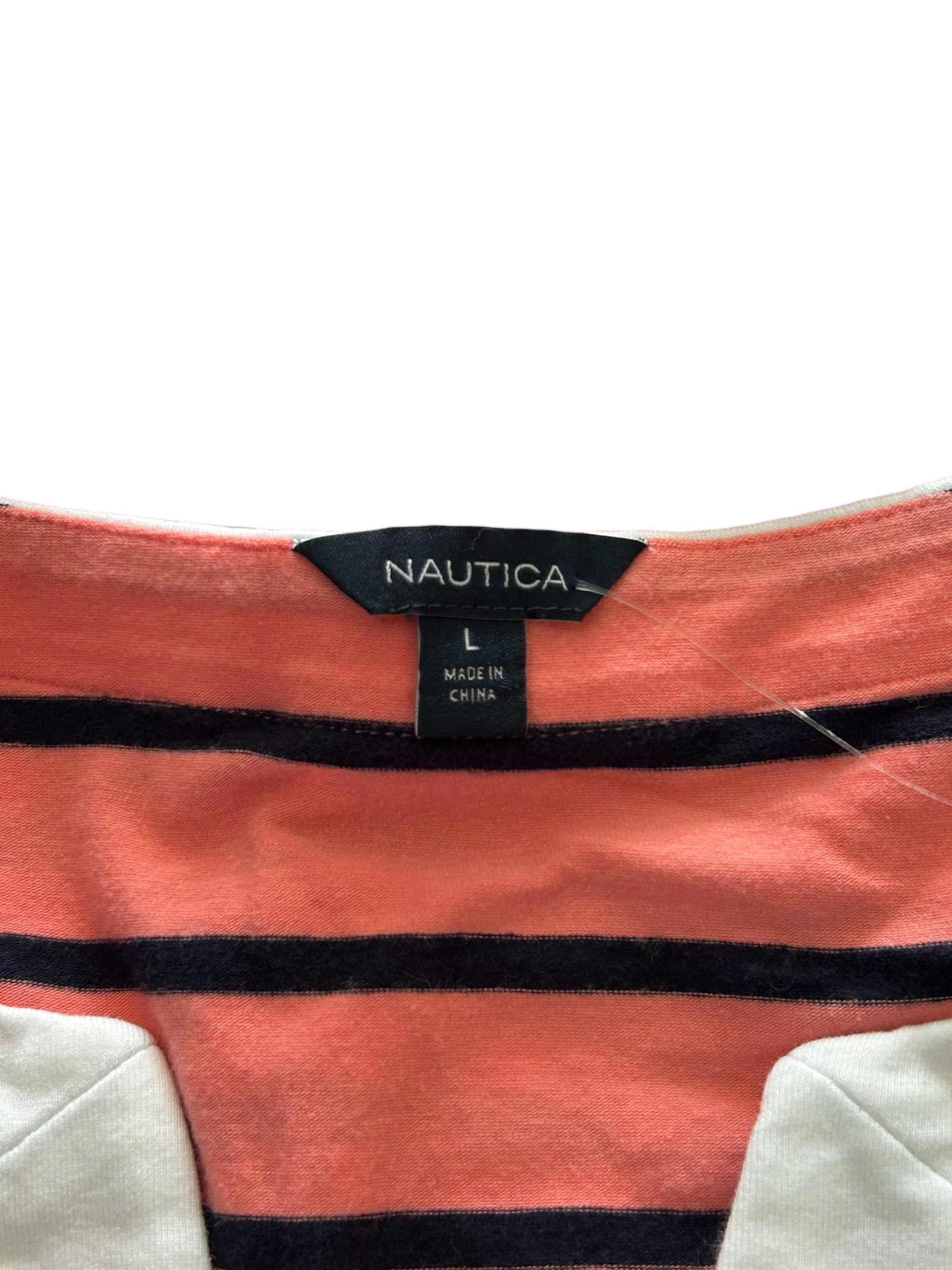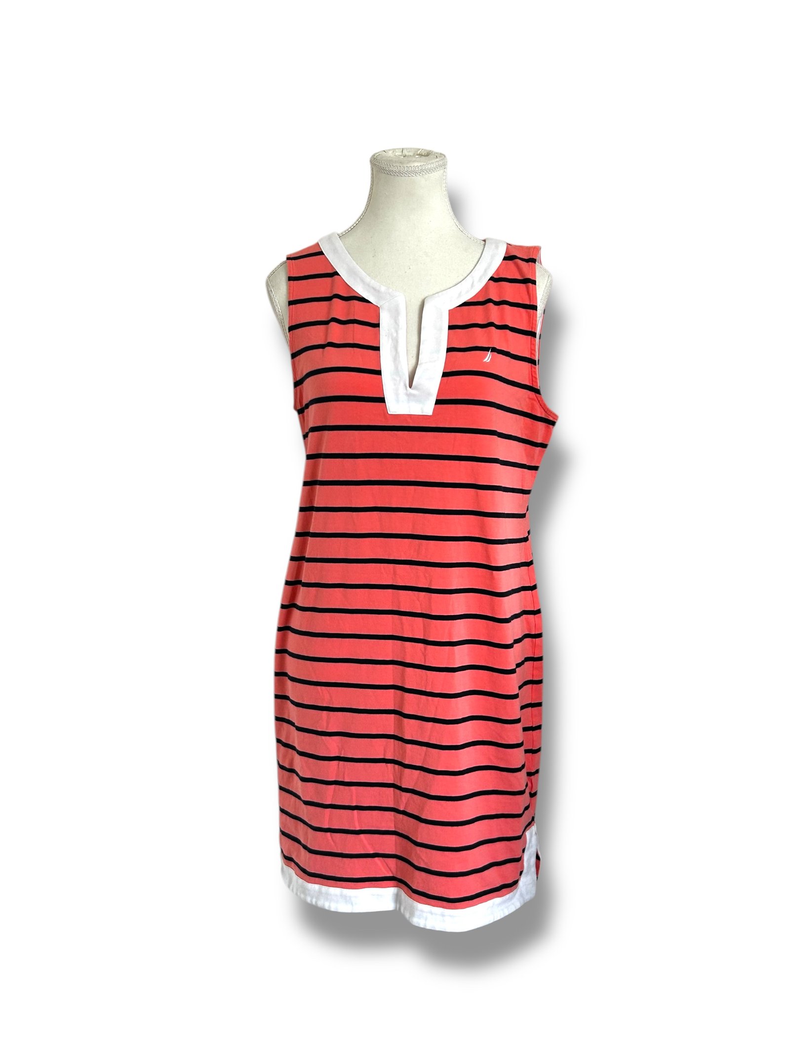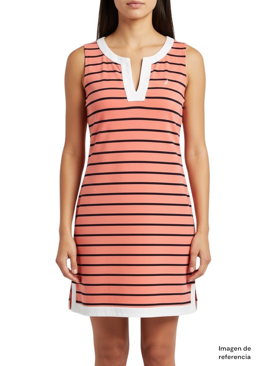 Vestido de la marca Nautica en talla L, confeccionado en tela suave y ligera que brinda comodidad durante todo el día. Presenta un diseño de rayas horizontales en color coral con negro, complementado con detalles en blanco en el cuello y el ruedo que le aportan un contraste elegante.