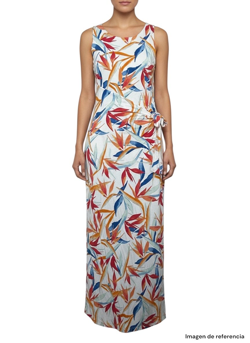 Destaca por su estampado tropical multicolor en tonos vibrantes como rojo, azul, naranja y verde, perfecto para climas cálidos o looks de verano. Su diseño incluye tirantes anchos, escote redondeado y un detalle cruzado con lazo lateral, que estiliza la cintura y aporta un toque elegante.