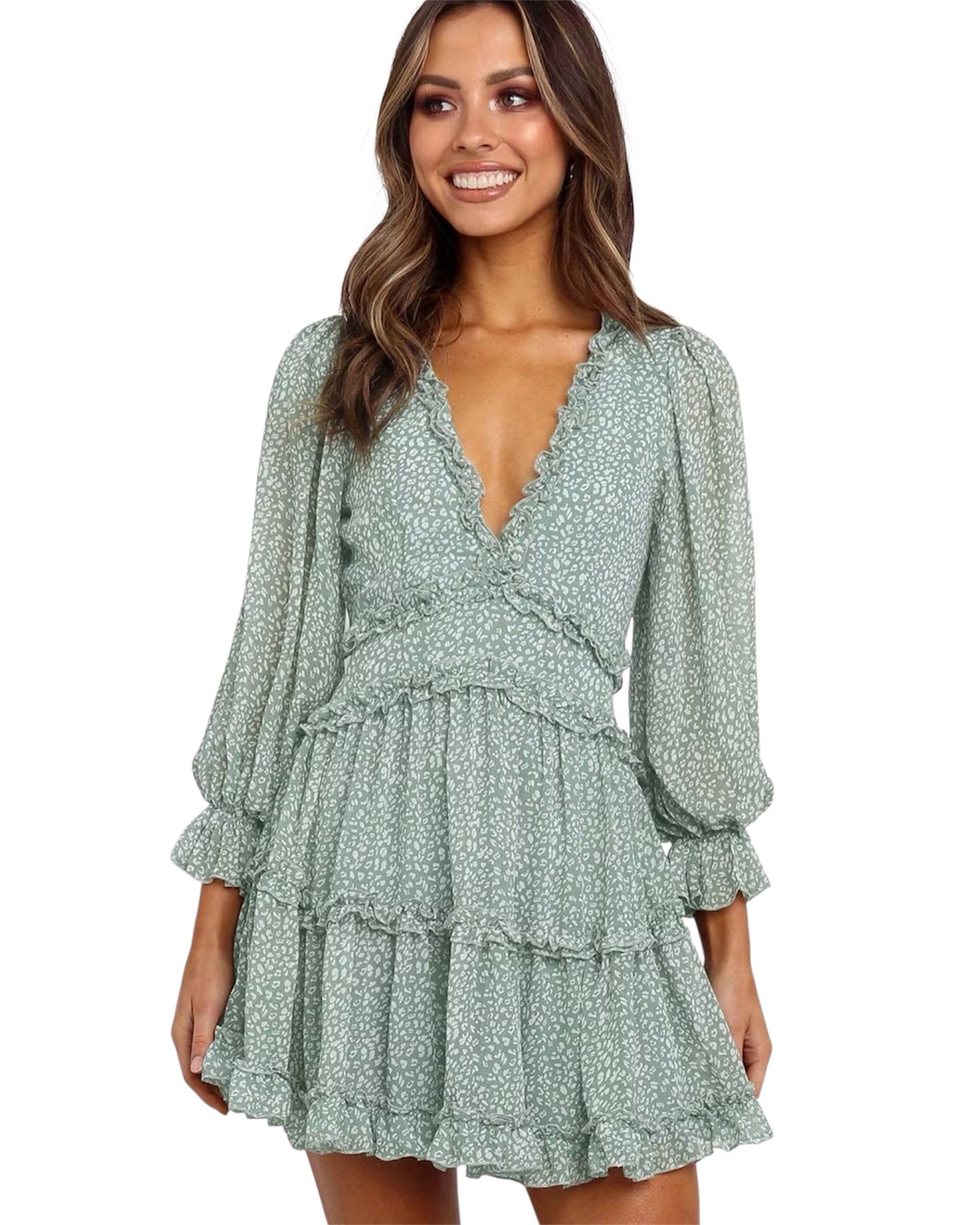 Hermoso vestido en talla S color verde con estampado delicado en tonos claros. Cuenta con escote en V y detalles de volantes que le dan un estilo femenino y elegante. Sus mangas largas con terminación en volantes y su falda en capas crean un look ligero y fluido. Es una prenda cómoda y versátil, ideal para salidas, reuniones, citas o para un look casual chic.